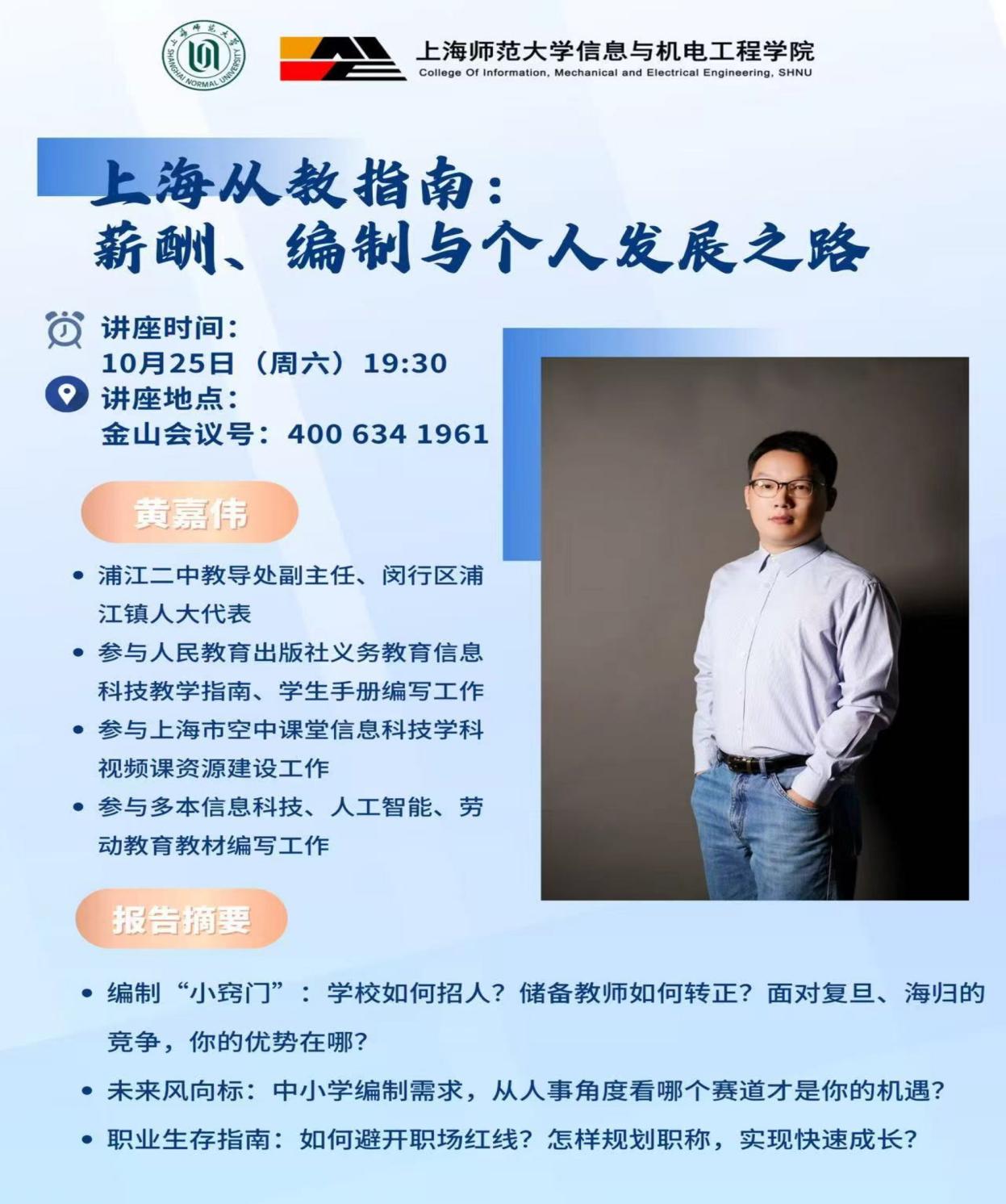 为聚焦师范生就业需求,我院特邀上海市闵行区浦江第二中学教导处副主任、2010 级计算机师范专业毕业生黄嘉伟老师,以线上会议形式开展题为《上海从教指南》的就业专题讲座。讲座历时一个半小时,吸引全院 170 余名师范专业同学报名参与,为即将步入职场的师范生提供了极具针对性的 “实战” 参考。