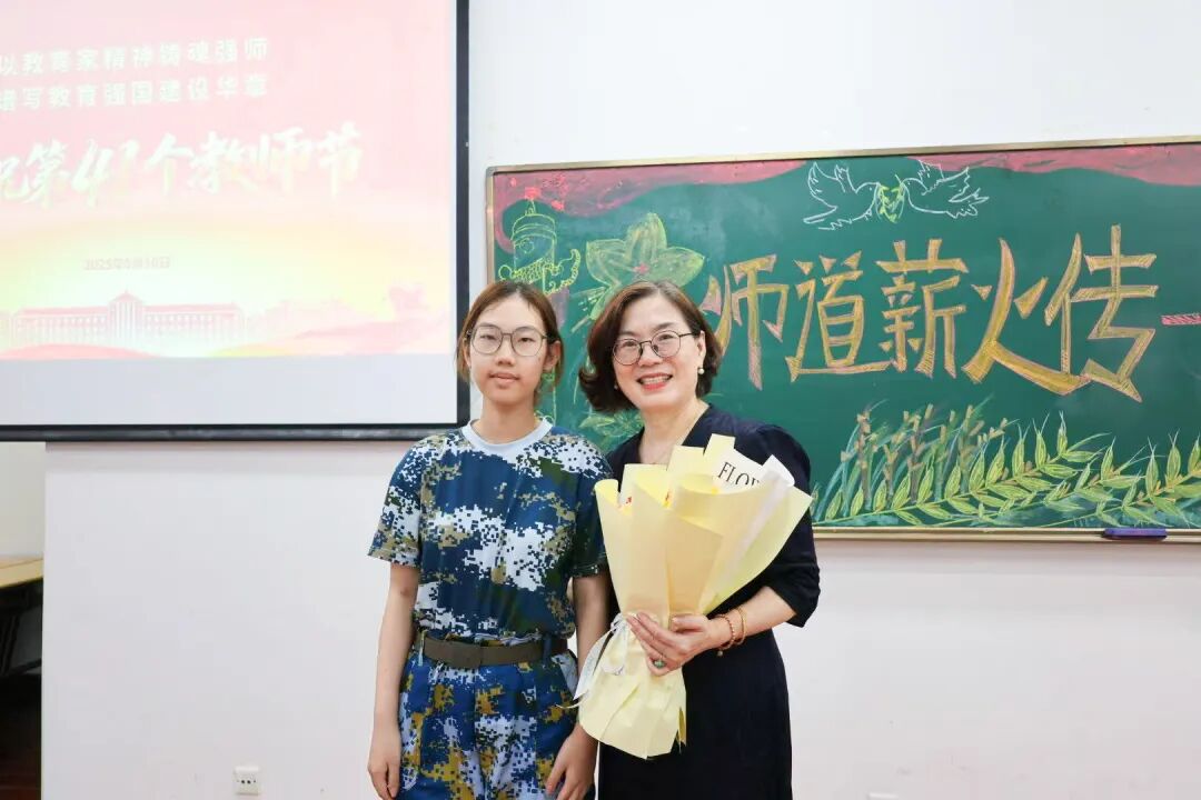 适逢第41个教师节,活动特设惊喜环节,2025级日语专业新生、青溪中学2022届毕业生夏芯怡同学为薛校长献上鲜花,并给予她一个深情的拥抱。一束花,一个拥抱,既是感恩的表达,更是教育火种代代传承的生动象征。