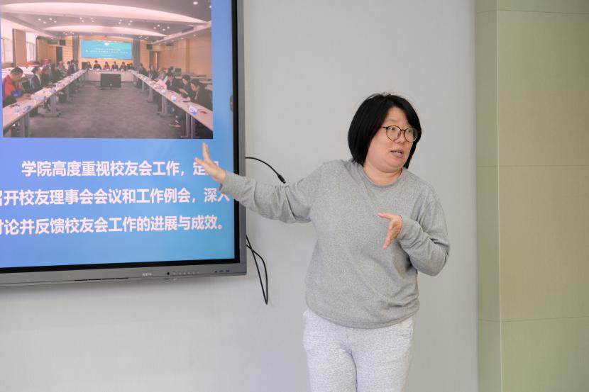 臧艳雯以“桃李天下铭师道,语通世界铸英才”为题作校友会工作情况介绍,介绍了学院校友工作的做法与成效。随后,她聚焦学院学生工作进行简要介绍,重点围绕“外语+X”育人模式分享实践成果。她表示,未来将继续携手校友不断深化各项工作,共谱学院发展新篇章。