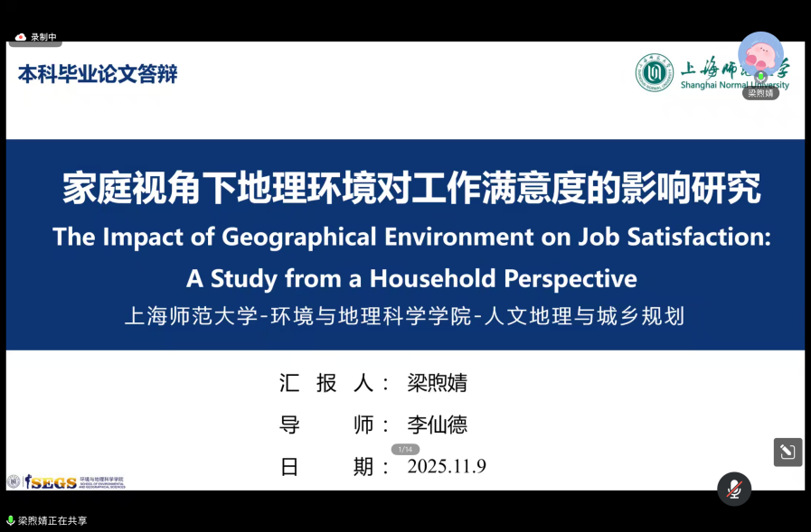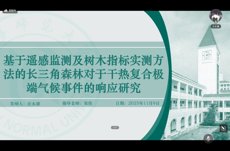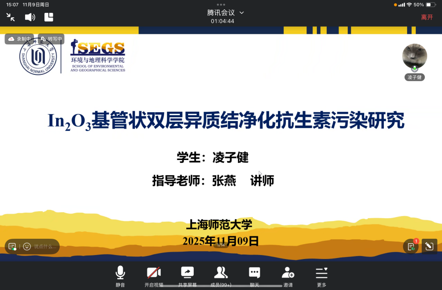 地理科学(师范)专业2021级校友汪永康同学以《长三角森林对干热事件的响应研究》为题,构建综合干热指标,结合遥感与实地数据,分析2022年及近二十年干热事件的时空特征,评估不同树种在极端条件下的生理响应差异及结构性特征。地理信息科学专业2021级校友陈提同学在《基于深度学习的长三角水体识别》研究中,提出一种新型水体标签生成算法,缓解样本短缺问题,并采用“双教师知识蒸馏”U-Net模型,增强模型的泛化能力与自动化水平。人文地理与城乡规划专业2021级校友梁煦婧同学从家庭视角出发,基于2016、2018年中国劳动力动态调查数据,探讨地理环境、交通通勤及社会人口因素对工作满意度的直接与间接影响,并分析夫妻间关系在其中的作用。环境工程专业2021级校友凌子健同学聚焦抗生素污染问题,在《氧化银-硫化锌异质结光催化降解抗生素》中成功制备管状异质结材料,系统评估其在可见光下对四环素的降解性能。