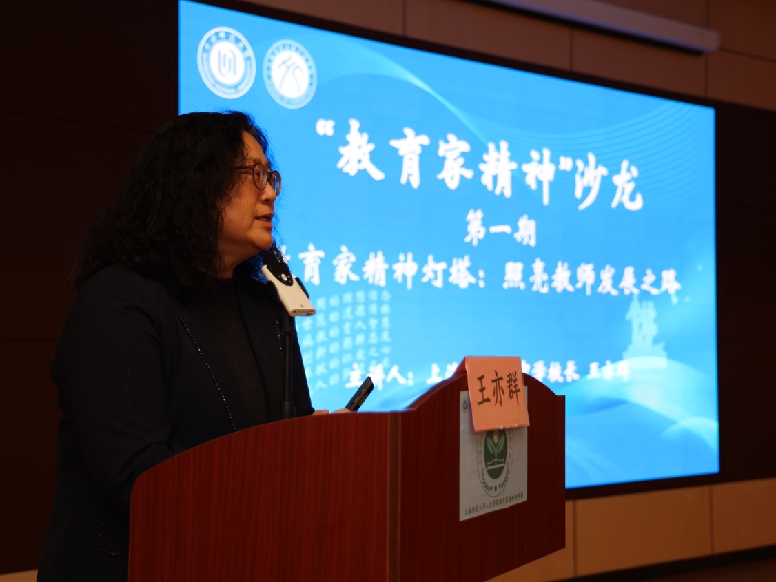 2025年11月12日下午,人文学院“教育家精神沙龙”第一期在奉贤校区科技楼B101举行。本次沙龙邀请到1986级中文系校友、上海市特级校长、上海市位育中学校长王亦群作为主讲嘉宾,以“教育家精神灯塔:照亮教师发展之路”为题与人文学子开展了交流分享。人文学院“教育家精神种子班”2024级汉语言文学(师范世承)班全体同学与2025级学生代表参加。