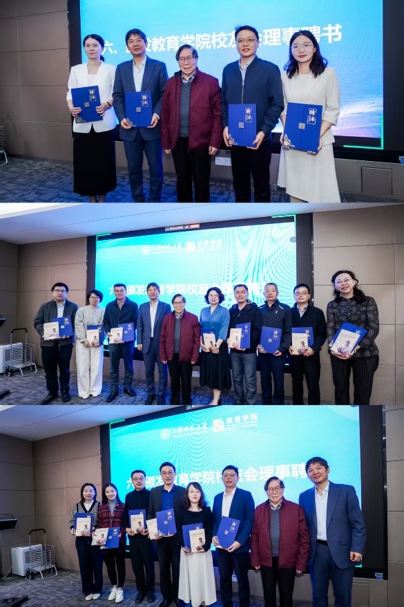 大会同时审议《教育学院校友会第三届理事会理事与主要负责人建议人选名单及产生情况说明》,经举手表决选举产生新一届理事会。杨德广当选为理事会名誉顾问,黄海涛当选为会长,张继龙当选为副会长,潘梦琳当选为秘书长,耿婕当选为副秘书长。本届理事会共有28名理事,均为来自教育领域的代表性校友,在行业内具有广泛影响力。杨德广、黄海涛分别为新当选的理事颁发聘书、赠送书籍。