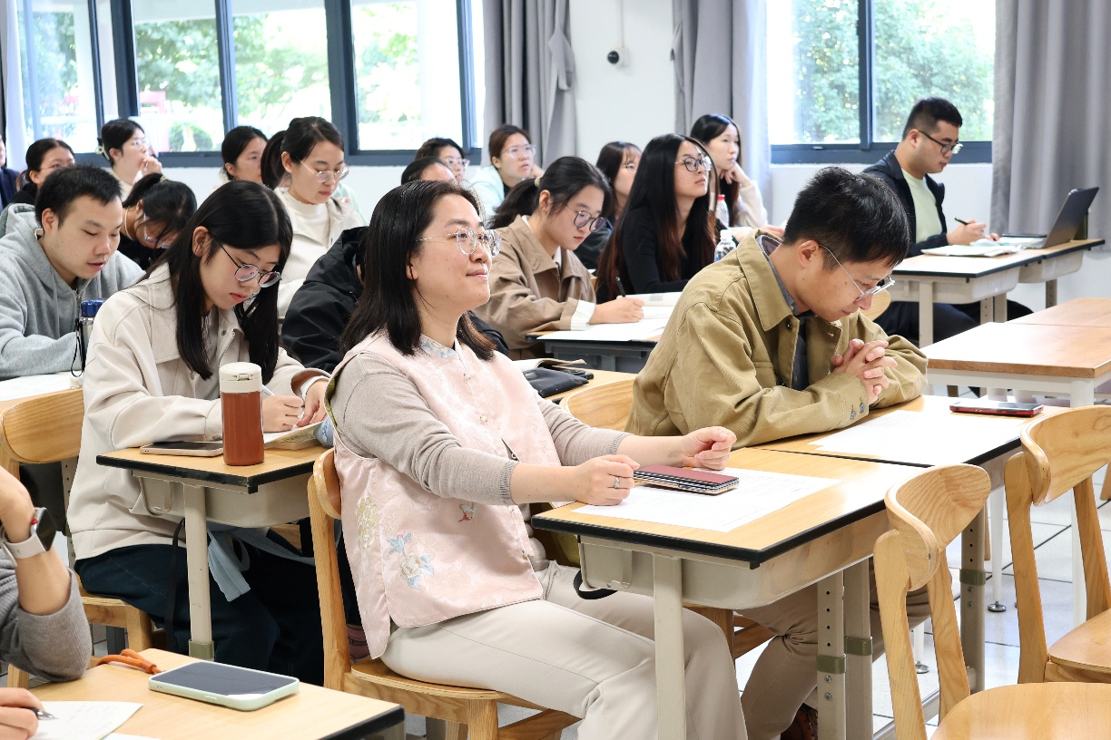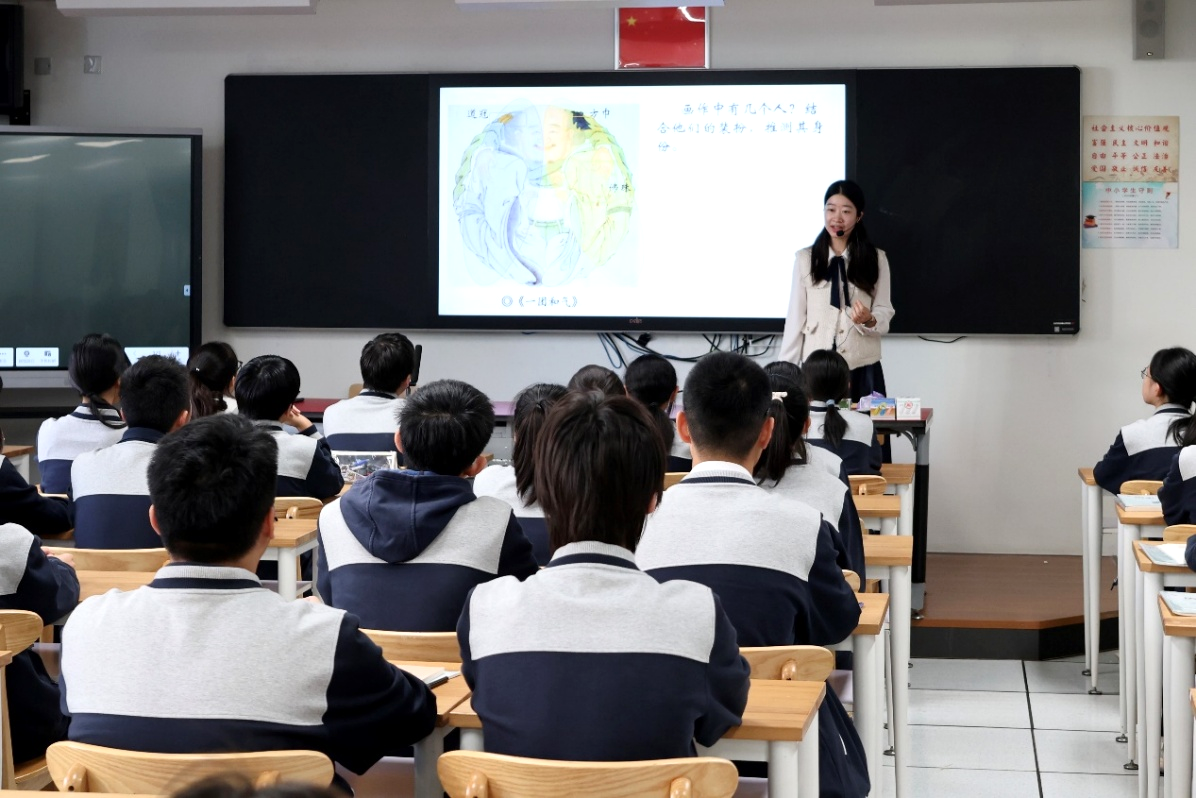 在高中历史课观摩环节,人文学院 2019 级学科教学(历史)专业校友、上海市向明中学青年教师刘叶敏,作为学院重点联络的优秀校友代表,执教《中外历史纲要(上)》第二单元第 8 课《三国至隋唐的文化》。课堂上,刘叶敏校友以绘画作品《一团和气》为引,引导学生提取图像中的儒、道、佛文化元素,巧妙串联历史知识,其精湛的教学能力不仅展现了师大师范教育的育人成果,也为在场的高校师范生提供了生动的教学范例。这堂校友示范公开课,正是学院依托校友资源开展实践教学指导的重要环节,让师范生近距离学习优秀校友的教学经验。