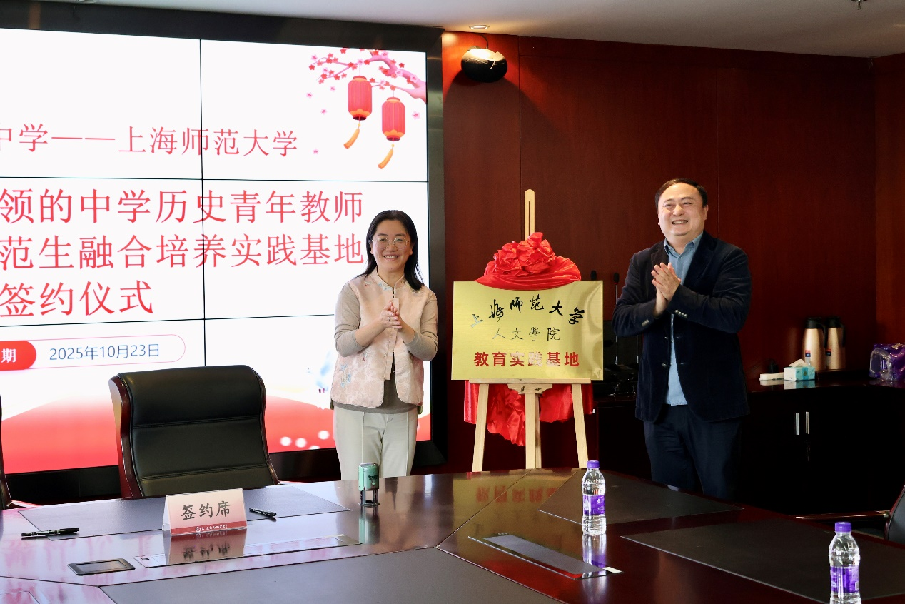 仪式最后,上海师范大学人文学院姚霏副院长与上海市向明中学胡宏校长签署合作协议书,并共同为“上海师范大学人文学院教育实践基地”揭牌。此次合作的达成,源于人文学院对校友资源的精准挖掘与主动对接,是学院以校友工作为抓手,推动师范教育创新的重要突破。未来,学院将持续深化校友工作,以更多校友集中任职单位为合作切入点,探索“中学青年教师(校友)- 高校师范生联合培养”模式,让校友资源成为连接高校与基础教育的重要纽带,为基础教育高质量发展与师范人才培养贡献更大力量。