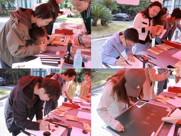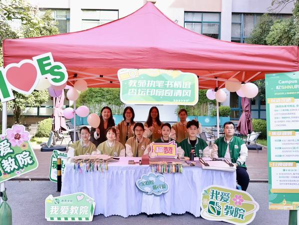 教育学院精心策划了兼具仪式感与互动性的系列环节,以“执笔”“印扇” 为核心,深度融合师范底蕴与校友情感联结,让校友们在沉浸式体验中重拾校园记忆,感受母院的文化传承。活动中,户外书写专区成为校友们溯回青春的起点。宣纸如卷轴般徐徐铺展,浸润着岁月的沉香;笔墨错落,悄然复现当年伏案备课的温润场景。校友们纷纷驻足抒怀,或蘸墨挥毫书尽对母校的感恩,或执硬笔誊写对后辈的期许,或握粉笔勾勒板书重拾往昔试讲时光,一笔一画间皆是跨越岁月的情谊流转。教育学院志愿者团队全程暖心护航,从活动引导到答疑问询,脸上笑意融融,让校友的归程满是暖意。