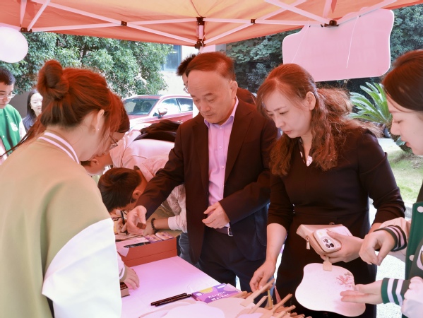 秋阳暖照,墨香漫溢田家炳楼;清风徐来,扇韵轻摇校友情长。10月25日,上海师范大学教育学院举办“教苑执笔书情谊,杏坛印扇寄清风”校友返校日活动。阔别校园的校友们循着书香归队,与师长同窗重聚,在笔墨流转与扇影轻晃间重温青春岁月,共叙教育情怀。上海师范大学副校长、校友会副会长蒋明军,学校办公室副主任、校友会秘书长陈燕一行来到学院摊位前与校友和志愿者亲切慰问与交流,让回家的校友们更加感受到学校的温暖与关心。