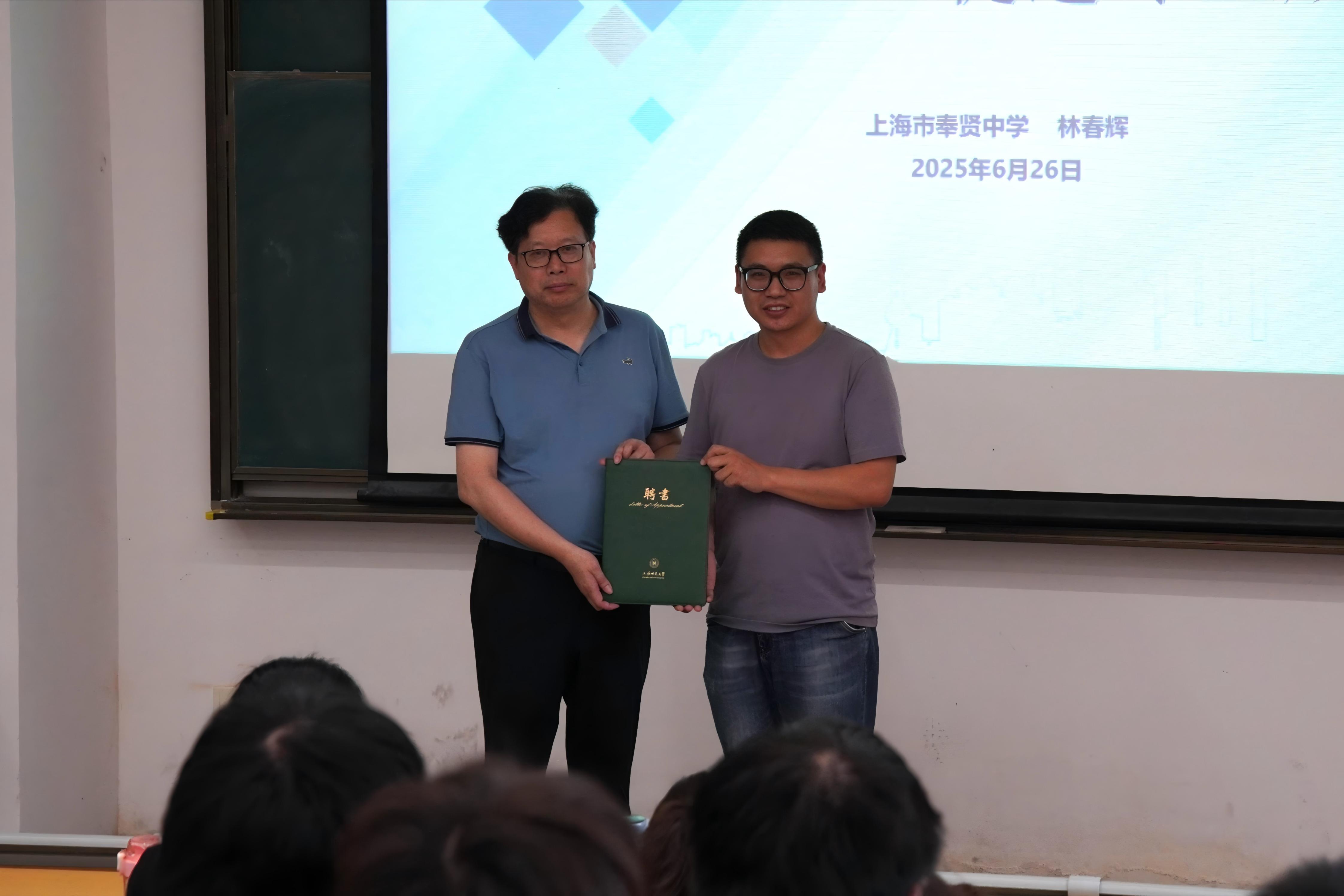 讲座伊始,杨建文副主任为林春辉校长颁发了上海师范大学数理学院兼职教授聘书,并对林春辉校长的卓越成就进行了简单介绍。林春辉校长多年来注重教育教学规律,促进学校课程及资源建设,有效推动学校课程教学改革,探索出一条具有奉贤中学特色的育人模式。他提出了“潜能教育”思想,认为教育的使命就是使学生自身蕴藏的潜能经历“发现—唤醒—释放”的过程,最终发展为学生关键能力和必备品格。