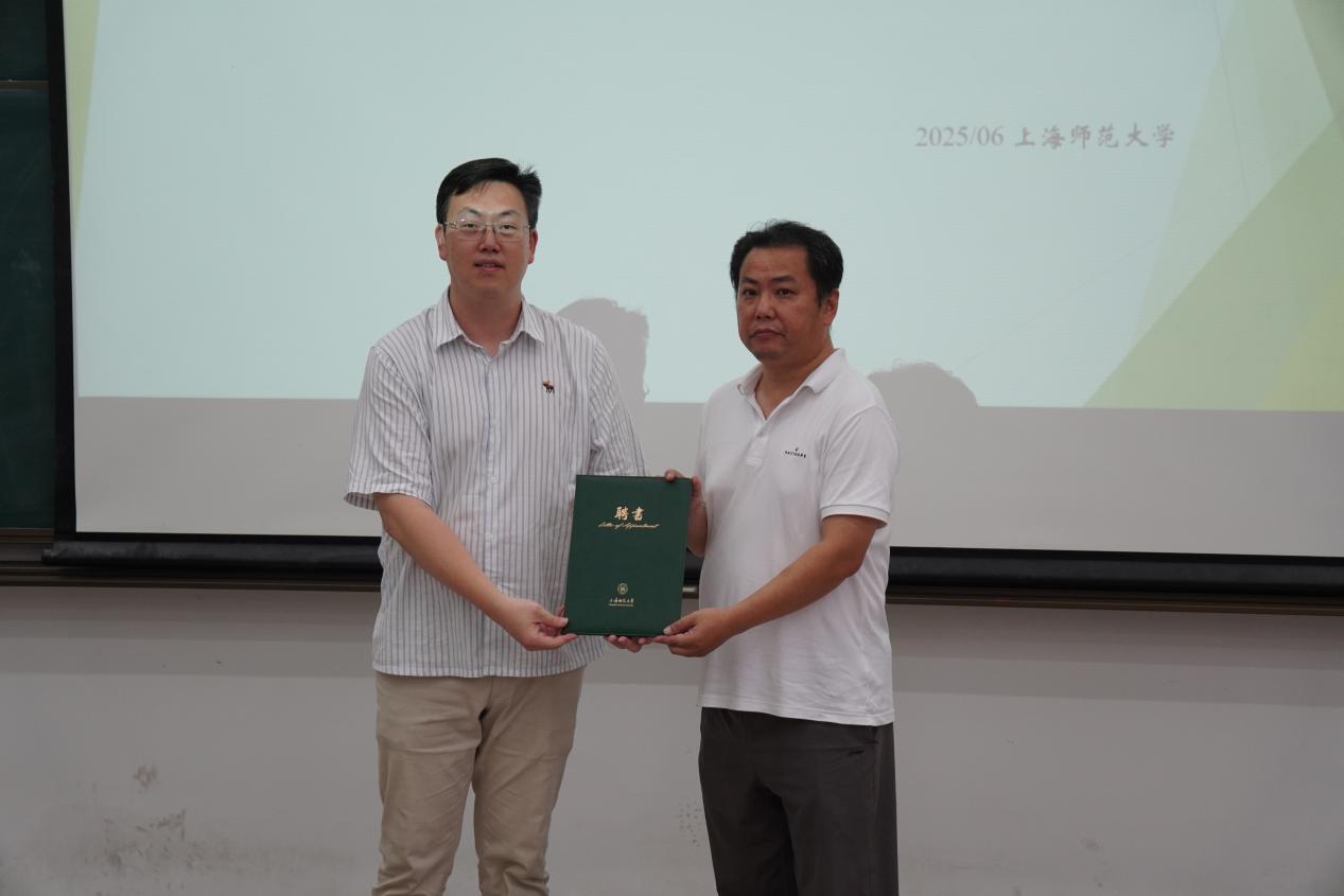 讲座伊始,林恺副书记代表学院为朱臻老师颁发了上海师范大学数理学院特聘教授聘书。随后,林恺副书记简要介绍了这位杰出校友:朱臻老师是上海师范大学物理系95届校友,长期在上海中学任教并担任副校长,分管教学工作,具有丰富的教学和管理经验。今年1月,朱臻老师被聘为同济大学特聘教授,5月被任命为同济大学科技中学校长。作为上海市高考物理学科命题组专家和上海市高中学业水平考试物理学科命题专家,朱臻老师在物理教育领域具有深厚的理论功底和实践经验。