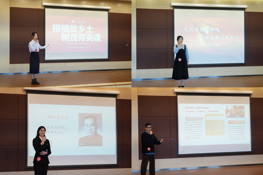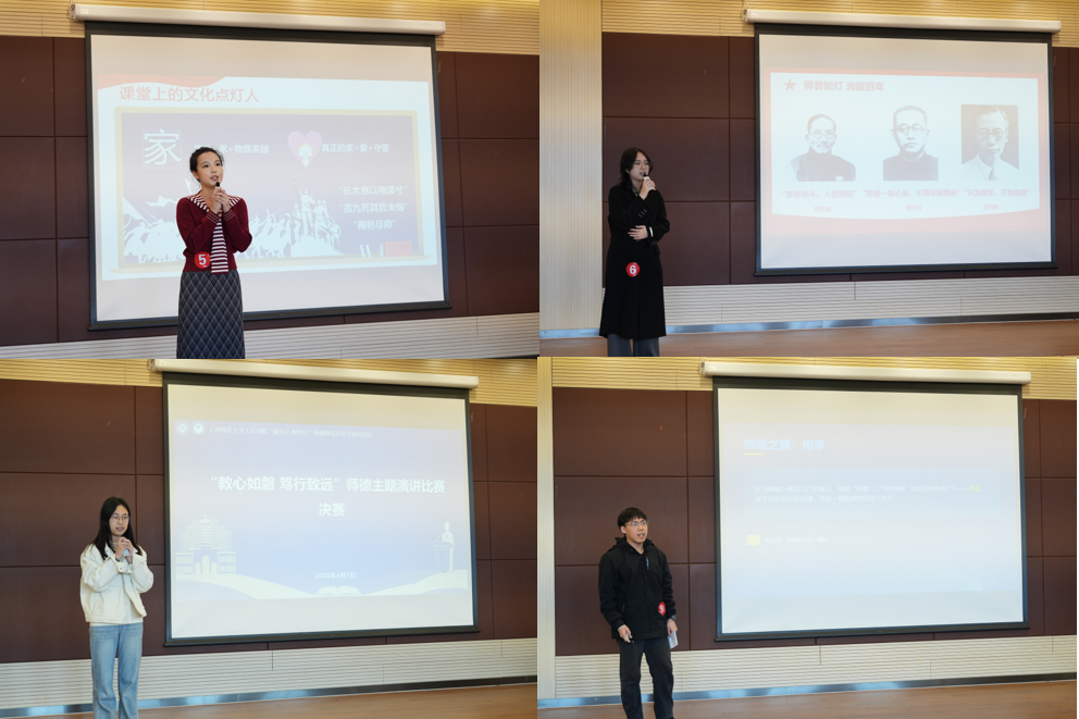 经初赛角逐,八位选手脱颖而出晋级决赛,选手们聚焦“立德树人守初心——新时代师范生的使命担当”“薪火相传担使命——青年学子的师德传承”“文化自信铸师魂——传承中华优秀传统文化中的师德实践”“清风正气守师道——新时代师德师风自律建设”四大主题方向,结合自身经历,从前辈师者的榜样引领、实践中的真实感悟等角度,生动讲述了新时代师范生对师德的理解与践行,展现了人文学子“蕴文心,树杏坛”的赤诚情怀。